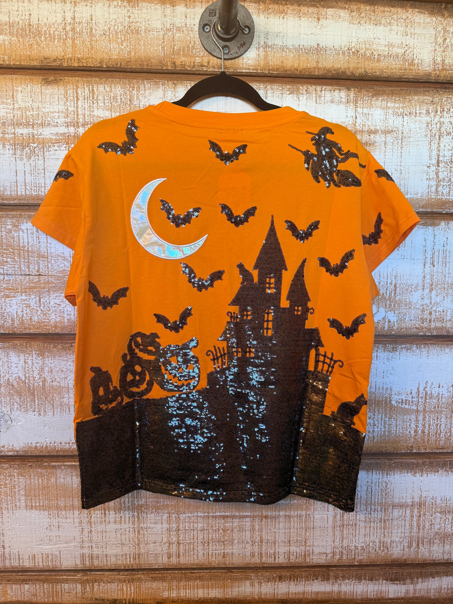 The perfect spooky tee!! Orange base featuring black sequin haunted house. Moon is done in a metallic fabric!! Slightly oversized!