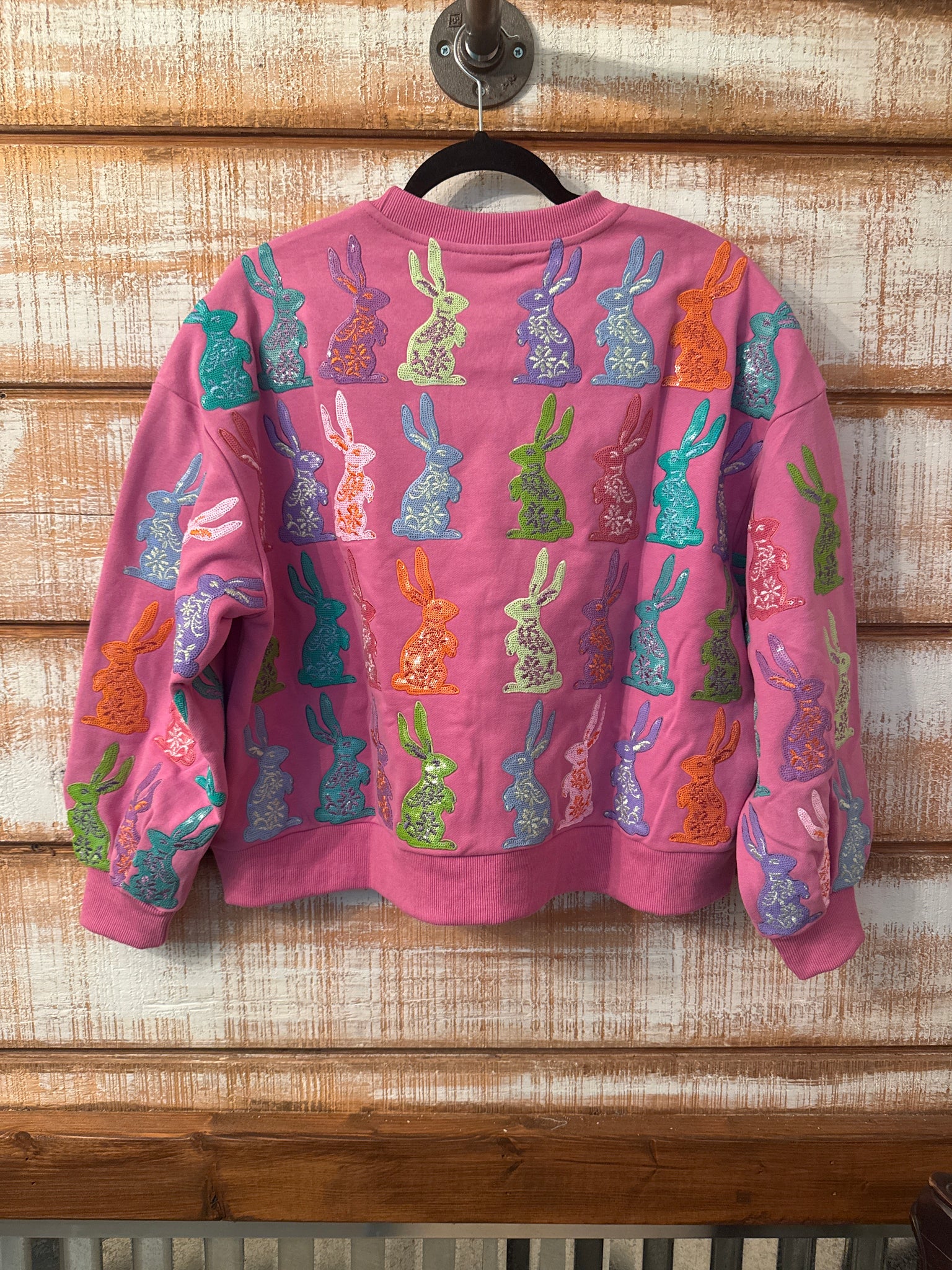 Perfect for the Easter season! Multi colored sequin bunnies 🐰 on beautiful purple crew! Don’t forget to grab the matching shorts for a cute set!