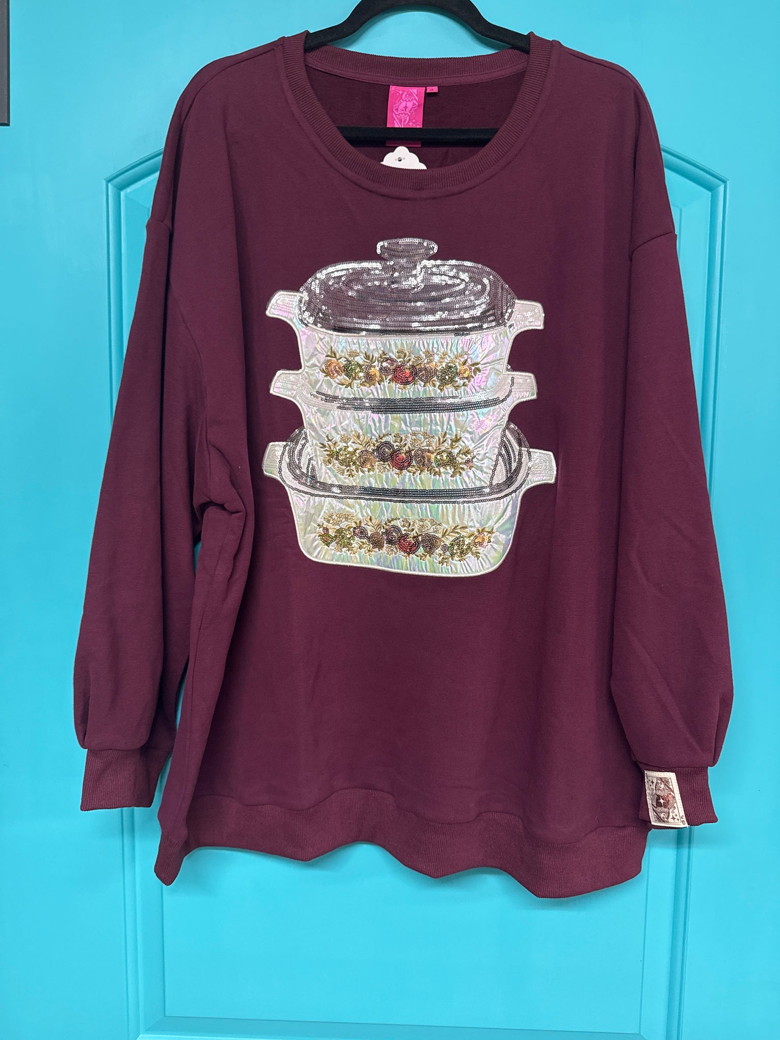 Perfect for any time of the year!! Vintage style CorningWare embellished on front of this rich maroon crewneck sweatshirts! Oversized fit