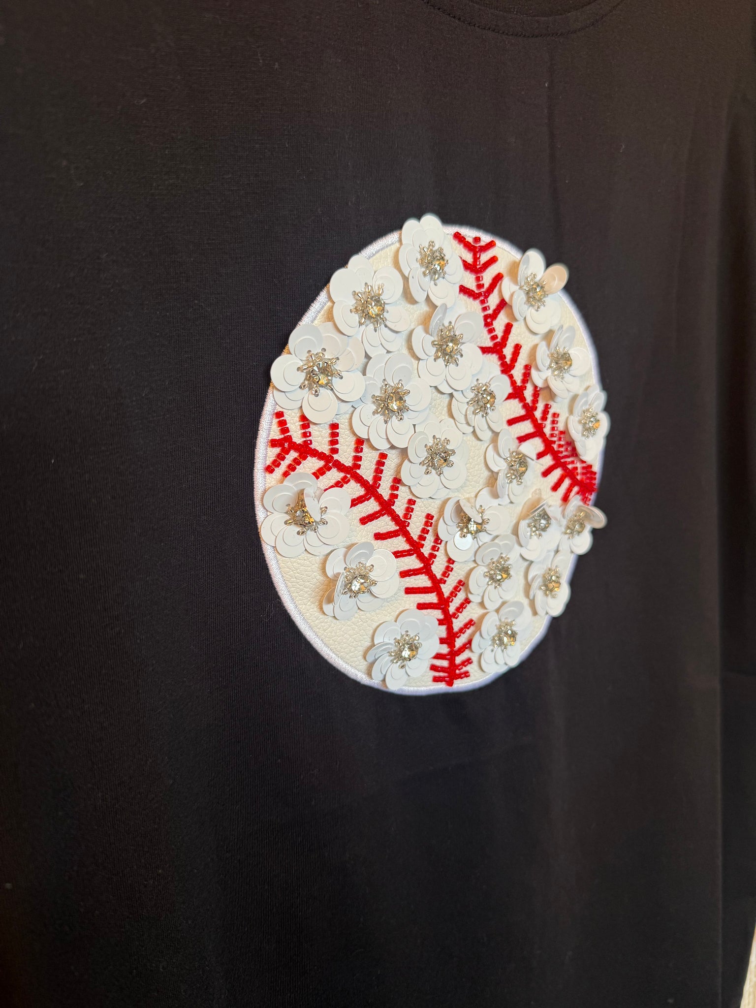 Black tee with 3D floral sequin in baseball design! Perfect to cheer on any team!