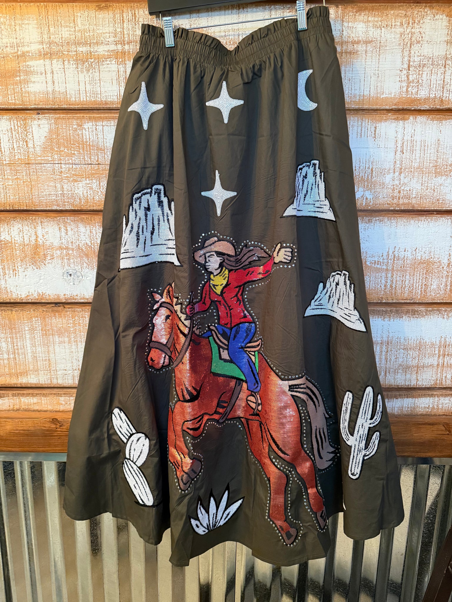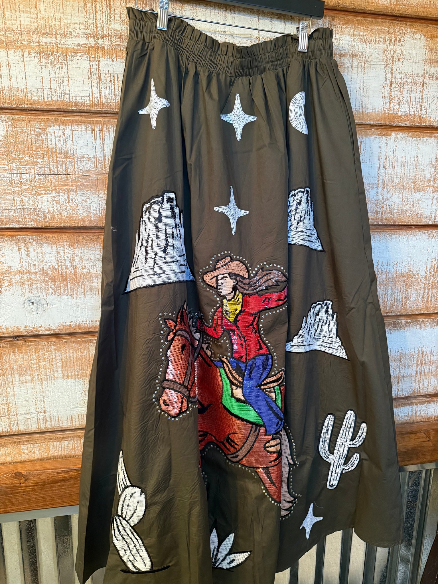 This one is a showstopper!!! Long maxi style skirt with an amazing cowgirl embellished on the front and back. It does have pockets! Can be pulled up and worn as a strapless dress also as this one is a longer style. Oversized fit!