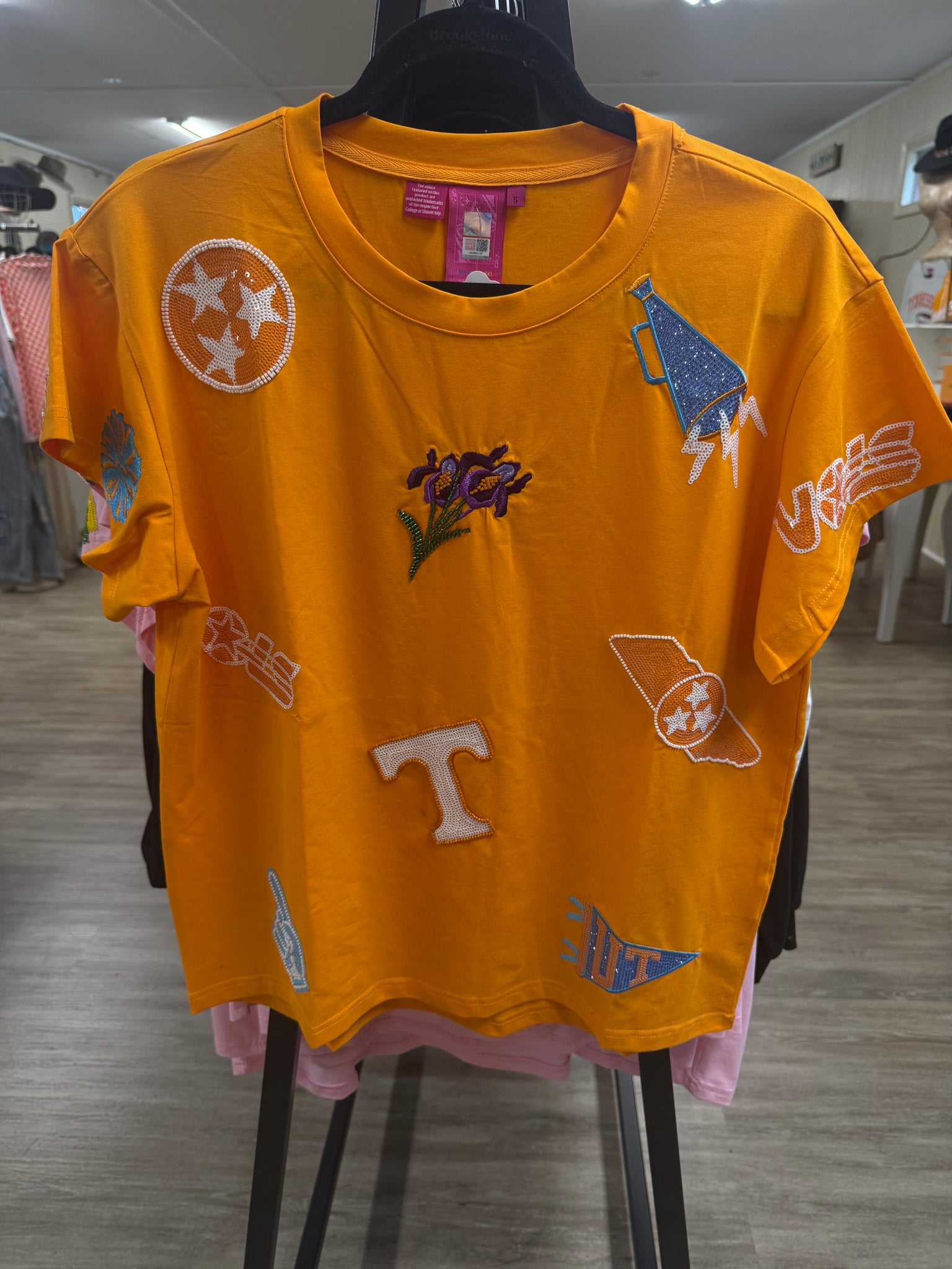 Orange tee with all things Tennessee scattered in sequins, beadwork, and embroidery!