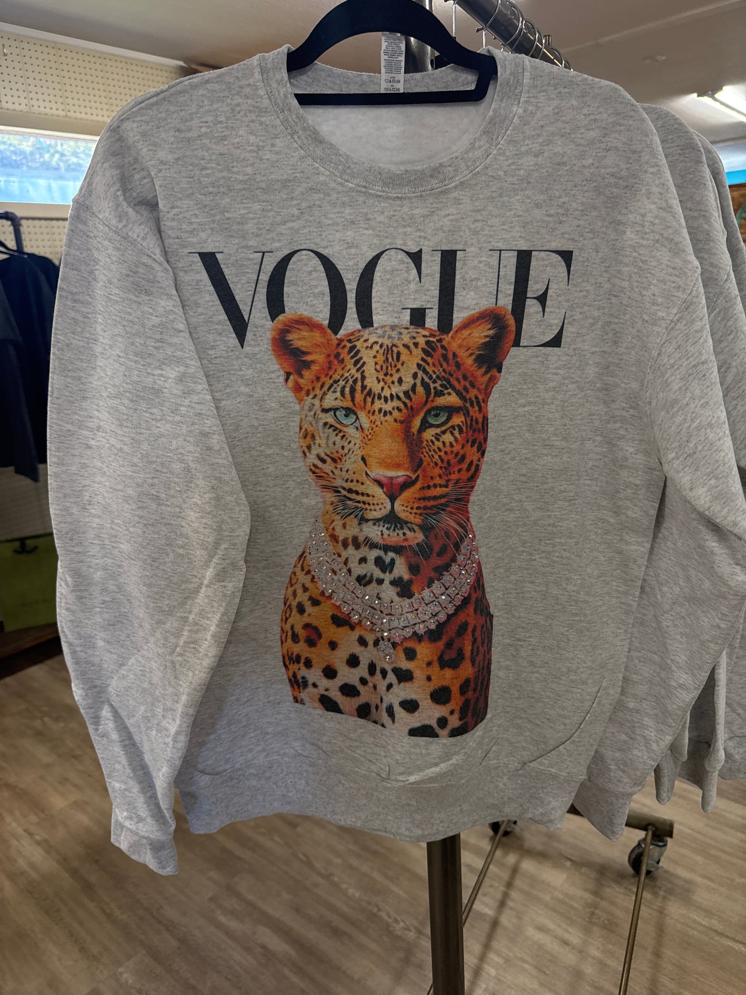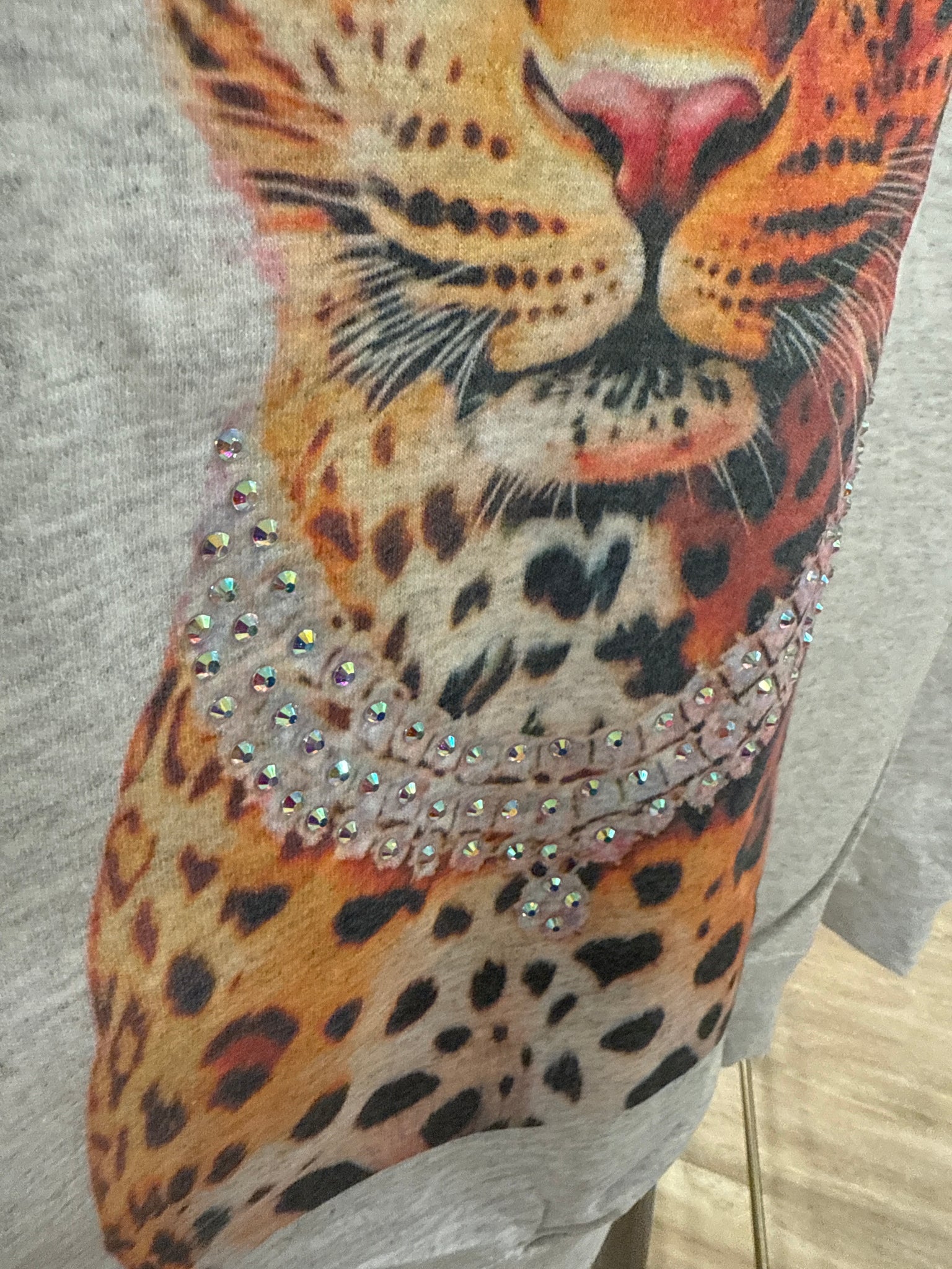 Crewneck grey sweatshirt with beautiful screenprint cheetah with bling leopard collar in AB stones.